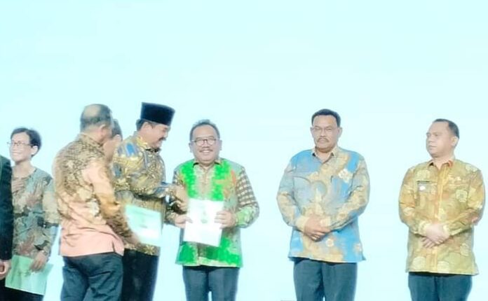 Sekda Humbahas, Tonny Sihombing mewakili Bupati, Dosmar Banjarnahor saat menerima sertifikat tanah dari Menteri Agraria dan Tata Ruang/Badan Pertanahan Nasional (ATR/BPN), Marsekal TNI (Purn) Hadi Tjahjanto.