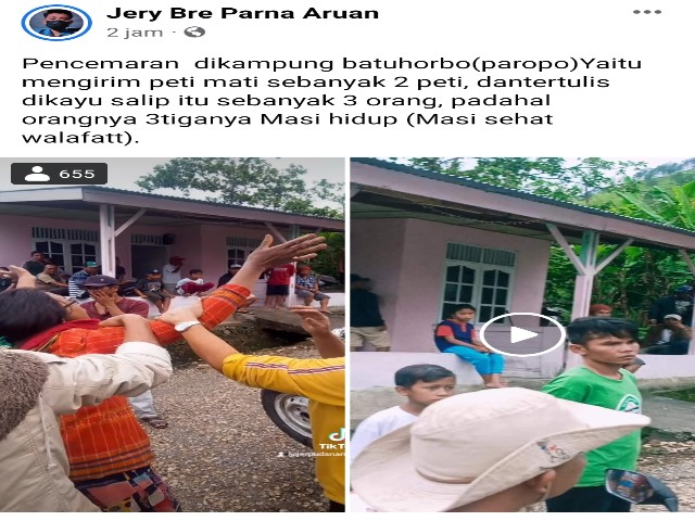 Seperti terjadi di Desa Paropo, Kecamatan Silalahi Sabungan, beredar di dunia maya atas nama akun Facebook Jery Bre Parna Aruan. Isi postingan itu menyebutkan terjadi pencemaran di Kampung Batu Horbo (Paropo) yaitu mengirim peti mati sebanyak 2 unit dan tertulis di kayu salib itu nama 3 orang, padahal ketiganya masih hidup (sehat walafiat).