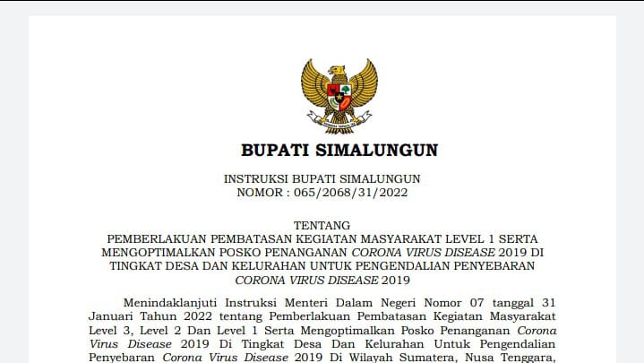 Instruksi Bupati Simalungun mengenai PPKM level 1.