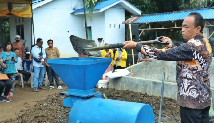 Asisten Perekonomian dan Pembangunan, Ramadhani Purba melakukan demonstrasi pembuatan pupuk organik.