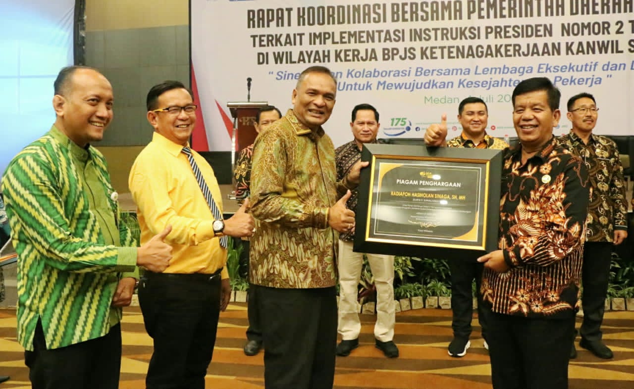 Penghargaan itu diserahkan langsung oleh Deputi Direktur Wilayah BPJS Ketenagakerjaan Wilayah Sumbagut, Panji Wibisana dalam rapat koordinasi (rakor) bersama DPRD dan pemerintah daerah terkait dengan implementasi Intruksi Presiden (Inpres) Nomor 2 Tahun 2021 di wilayah kerja BPJS Ketenagakerjaan Kantor Wilayah Sumbagut di Hotel Santika Premiere Dyandra Hotel dan Convention Medan, Senin (4/7/2022).