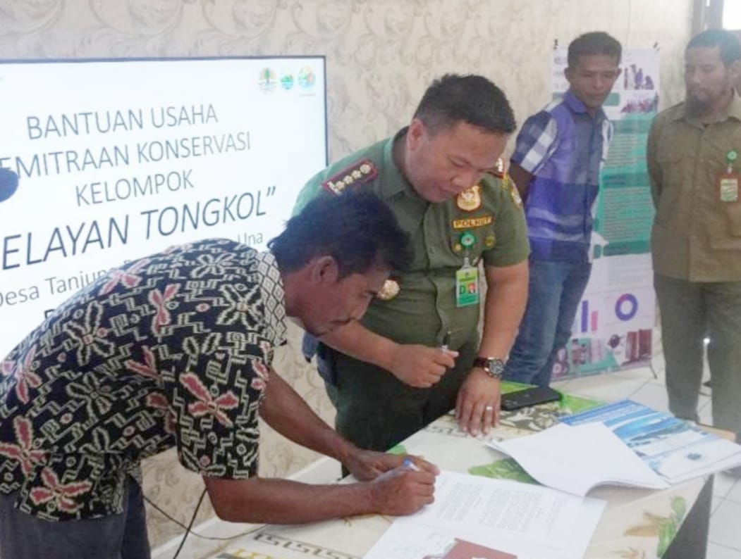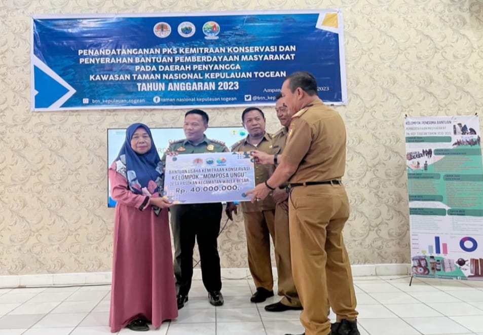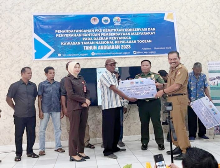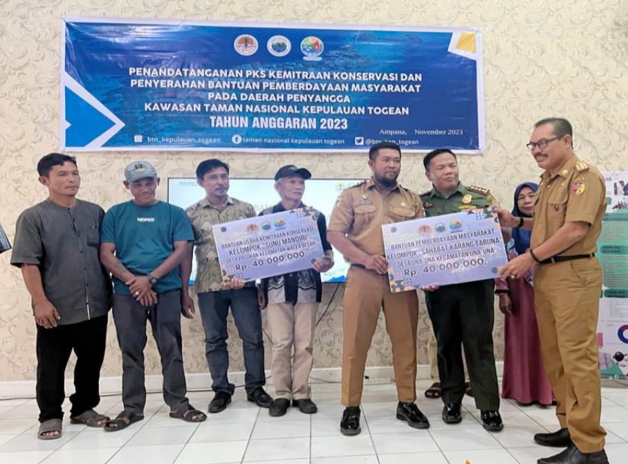 Ampana, Lintangnews.com | Pemerintah Kabupaten Tojo Una-Una, Sulawesi Tengah, bersama Balai Taman Nasional Kepulauan Togean menyerahkan bantuan pengembangan usaha ekonomi untuk meningkatkan pemberdayaan masyarakat desa di sekitar kawasan Taman Nasional Kepulauan Togean.