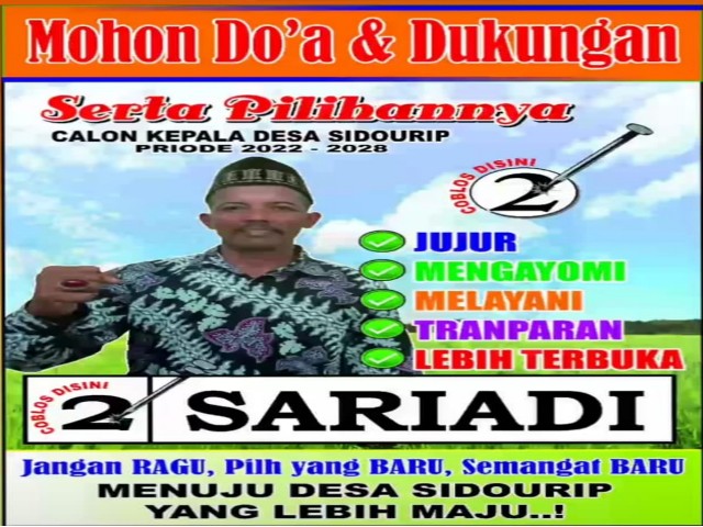 “Saya ikut Calon Kades karena merasa terpanggil untuk membawa perubahan di Desa Sidourip lebih maju, transparan, mengayomi dan lebih baik,” kata Sariadi yang mempunyai seorang istri dan 4 orang anak ini. (Idris)