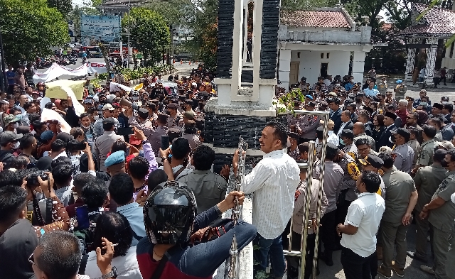 Petugas pun akhirnya mundur memberikan ruang pada massa agar spanduk petisi ditandatangani para anggota DPRD.