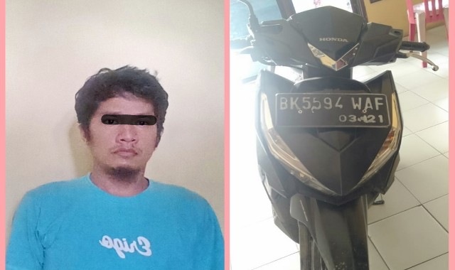 Pelaku M Ahfal Harahap, saat diamankan polisi bersama sepeda motor yang digadaikan.