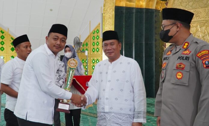 Bupati Deli Serdang, Ashari Tambunan menyerahkan piala pada juara lomba Gebyar Muharram 1444 H Kabupaten Deli Serdang tahun 2022.