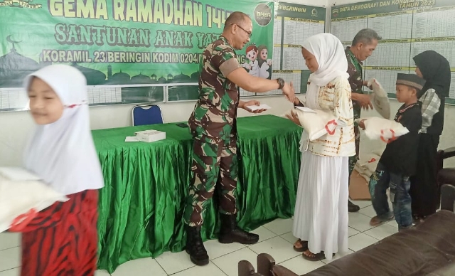 Deli Serdang, Lintangnews.com | Gema Ramadhan 1444 H dalam rangka menyambut Hari Raya Idul Fitri 1444 H, Koramil 23/BRG Kodim 0204/DS memberikan tali asih kepada anak yatim di Kecamatan Beringin, Kabupaten Deli Serdang.