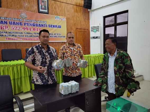 Kerugian negara sebesar Rp 522,9 juta itu diserahkan orang tua Herowhin TF Sinaga, Djaliman Sinaga kepada Kepala Kejaksaan Negeri (Kajari) Kota Siantar, Jurist Precisely Sitepu SH, Jumat (27/10/2023).
