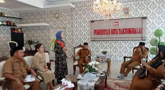 Fatimah saat bertemu Wali Kota, didampingi Kepala Dinas Kepemudaan, Olahraga dan Pariwisata Pemko Tanjungbalai, Muhammad Amin. (Elda)
