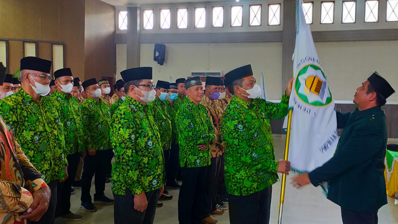 Ketua DMI Sumut, Irhamuddin (kanan) menyerahkan bendera petaka pada Ketua DMI Labura, Indra Surya Bakti Simatupang.