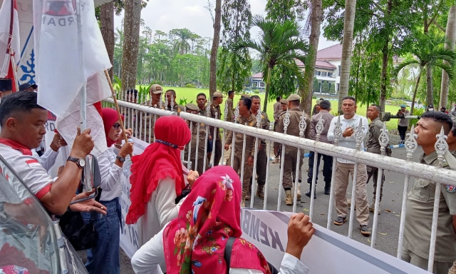 Massa Sedulur Jokowi melakukan orasi dijaga personil Kepolisian dan Satpol PP Pemkab Deli Serdang.