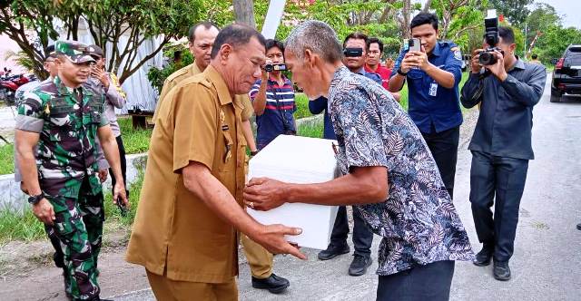 Mewakili warga dan nelayan, Sopian sembari menyerahkan buah tangan yang sudah dikemas di dalam fiber mengucapkan terima kasih pada Bupati dan Kepala Dinas Sumber Daya Air Bina Marga dan Bina Konstruksi (SDABMBK) yang telah membangun atau mengaspal jalan di Desa itu.