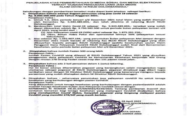 Pihak RSUD menjelaskan 4 poin fakta terkait pemberitaan tersebut. Di antaranya, pertama pemberitaan yang menyatakan adanya dugaan pencucian uang jasa Covid-19 sebesar Rp 9.000.000.000 pada tahun anggaran 2021.