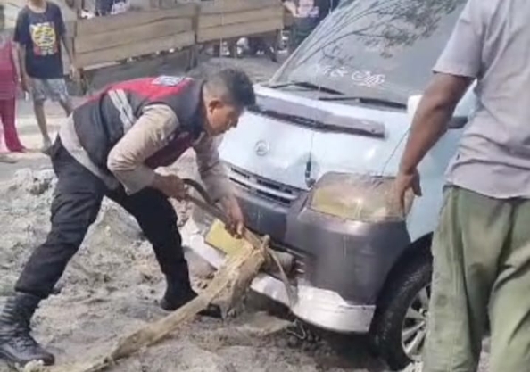 Setelah didorong beberapa orang, mobil pengunjung tersebut tidak bergerak. Kebetulan personil Polsek Pantai Labu yang setiap hari Minggu patroli dalam menjalankan tugas berada di lokasi.