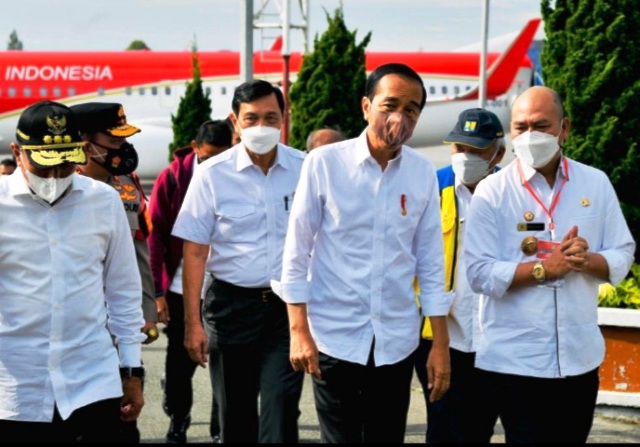 Taput, Lintangnews.com | Bupati Tapanuli Utara (Taput), Nikson Nababan bersama Gubernur Sumatera Utara, Edy Rahmayadi, Kapolda, Irjen Pol Panca Putra Simanjuntak menyambut hangat Presiden Joko Widodo dari Pesawat Kepresidenan saat landing di Bandar Internasional Silangit, Rabu (2/2/2022).