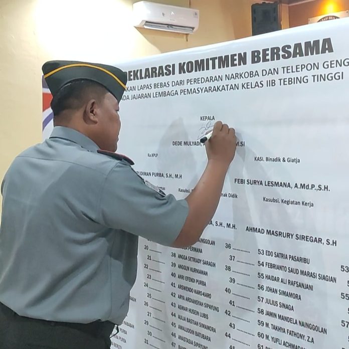 Tebing Tinggi, Lintangnews.com | Lembaga Pemasyarakatan (Lapas) Kelas IIB Tebing Tinggi melaksanakan apel pagi yang dirangkaikan dengan kegiatan deklarasi dan penandatanganan komitmen bersama Anti Narkoba dan Handphone Ilegal, bertempat di Aula Lapas. Seluruh pegawai, termasuk pejabat struktural, hadir dalam kegiatan ini, yang dipimpin langsung oleh Kepala Lapas Kelas IIB Tebing Tinggi Dede Mulyadi.