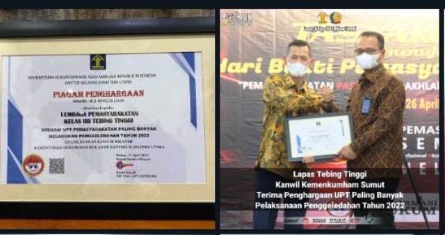 Tebingtinggi, Lintangnews.com | Peringatan Hari Bakti Pemasyarakatan (HBP) ke 58  pada bulan April 2022 lalu, Lembaga Pemasyarakatan (Lapas) Kelas IIB Tebingtinggi mendapatkan piagam penghargaan sebagai Unit Pelaksana Teknis (UPT) pada Kantor Wilayah Kementerian Hukum dan Hak Asasi Manusia (Kanwil Kemenkuham) Provinsi Sumatera Utara yang paling banyak melakukan penggeledahan tahun 2022.