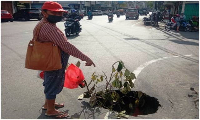 Sambung bapak 3 anak itu, warga ada yang jatuh saat melintas dan untung saja tidak masuk ke dalam lubang tersebut.
