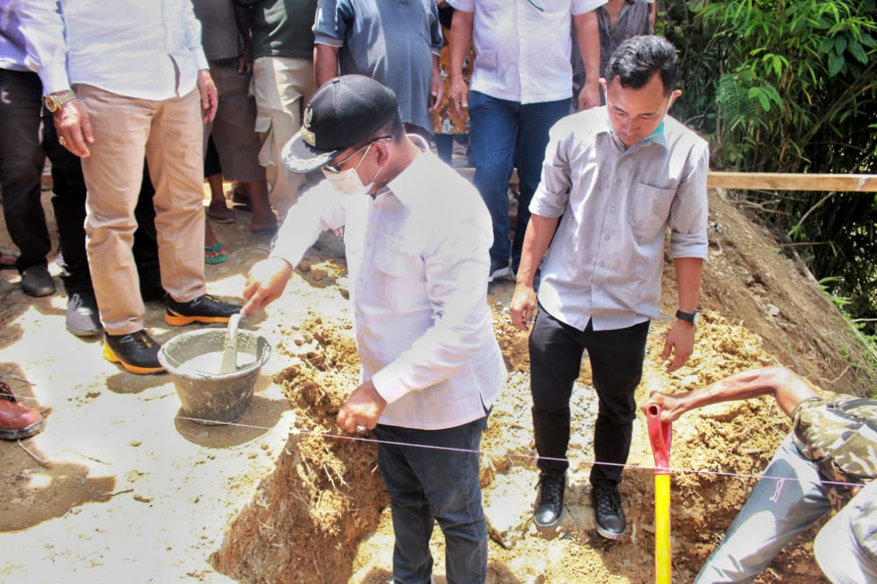 Simalungun, Lintangnews.com | Bupati Simalungun, Radiapoh Hasiholan Sinaga melakukan peletakan batu pertama pembangunan jembatan penghubung Huta Sipanga dan Bukit Kataran di Nagori Rembuhit, Kecamatan Gunung Maligas, Kabupaten Simalungun, Sabtu (16/4/2022).