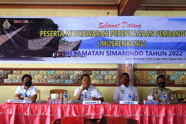 Musrenbang dibuka secara resmi oleh Asisten Perekonomian dan Pembangunan Daerah, Hotraja Sitanggang. Turut hadir dalam kegiatan itu, Staf Ahli Bupati Samosir, para pimpinan Organisasi Perangkat Daerah (OPD), Camat Simanindo, unsur Forum Koordinasi Pimpinan Kecamatan (Forkopimca), Kepala Desa (Kades), Tokoh Masyarakat, Tokoh Agama, Kepala Sekolah (Kepsek) dan Kepala Puskesmas (Kapus).
