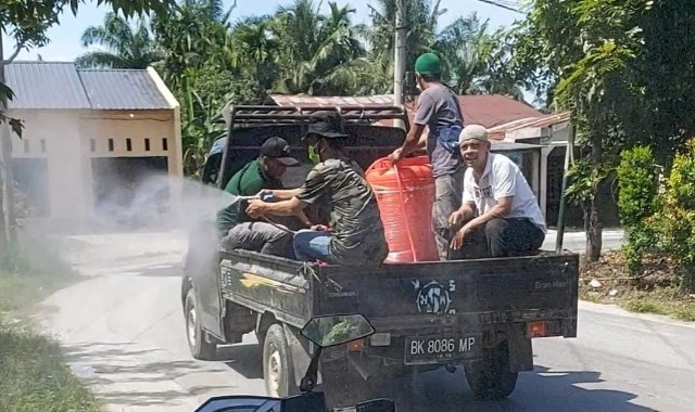 Tim penyemprotan yang dipimpin Kepala Desa (Kades), Zulkarnaen melakukan penyemprotan di 4 Dusun, rumah ibadah dan fasilitas umum lainnya.