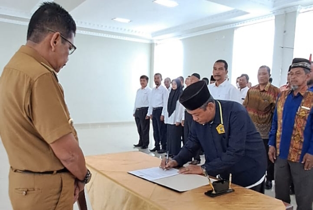 Pj Wali Kota Tebingtinggi, Muhammad Dimiyathi Lubis menyaksikan penandatanganan berita acara pelantikan.