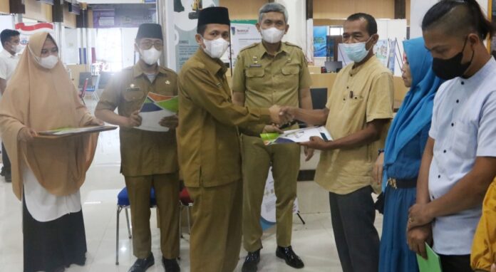 Plt Sekda Pemko Tebingtinggi, Bambang Sudaryono memberikan dokumen pernikahan.