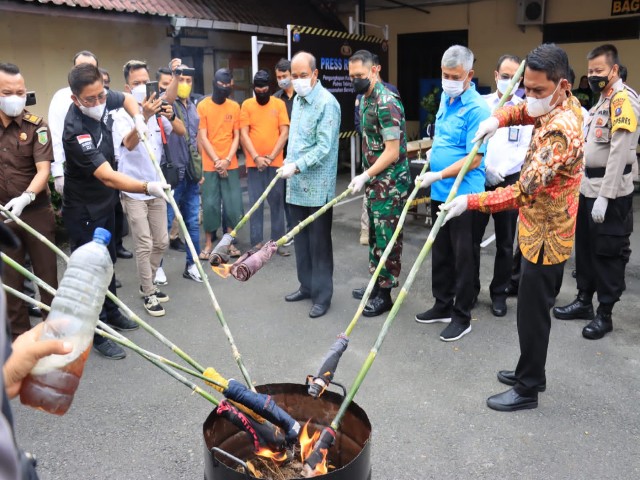 “Saat ini kita memusnahkan barang bukti ganja sebanyak 67,59 gram dan sabu 89,88 gram. Terkait dengan ini kami terus gencar melakukan kegiatan yang berkaitan dengan pemberantasan narkoba,” terangnya.