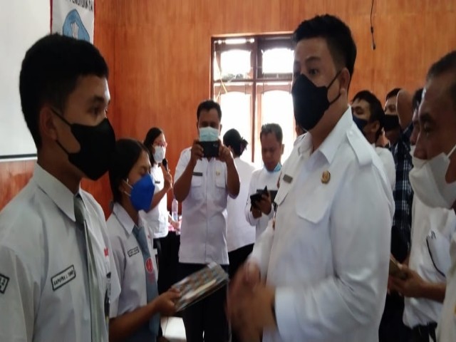 Bupati Samosir, Vandiko Gultom menyerahkan bantuan beasiswa pada pelajar yang berprestasi.