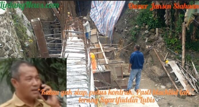 Kepala UPTJJS, Syarifuddin Lubis dan proyek pembangunan Talud/Turap/Bronjong di Nagori Tanjung Pasir Kecamatan Tanah Jawa, CV Pembangunan Nadajaya selaku penyedia jasa.