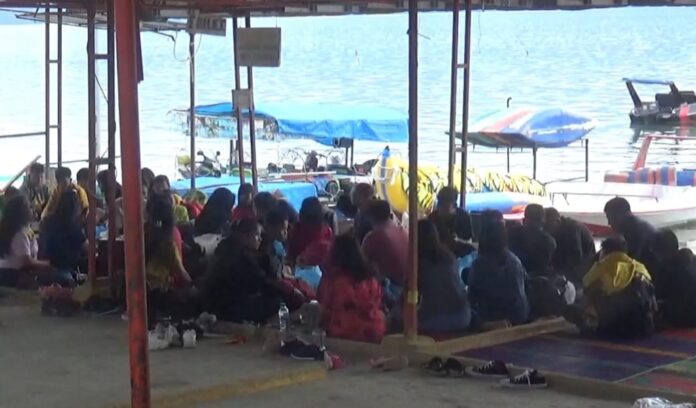 Para pengunjung di lokasi Pantai Pasir Putih Parbaba, Kabupaten Samosir.