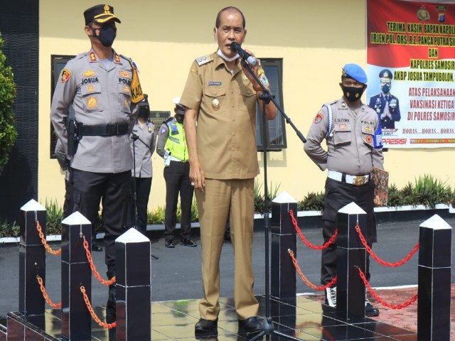 Kapolres Samosir, AKBP Josua Tampubolon menyampaikan, apresiasi kepada seluruh personil atas dedikasi dalam akselerasi percepatan capaian vaksinasi Covid-19, serta himbauan penegekan protokol kesehatan (prokes) di Kabupaten Samosir.