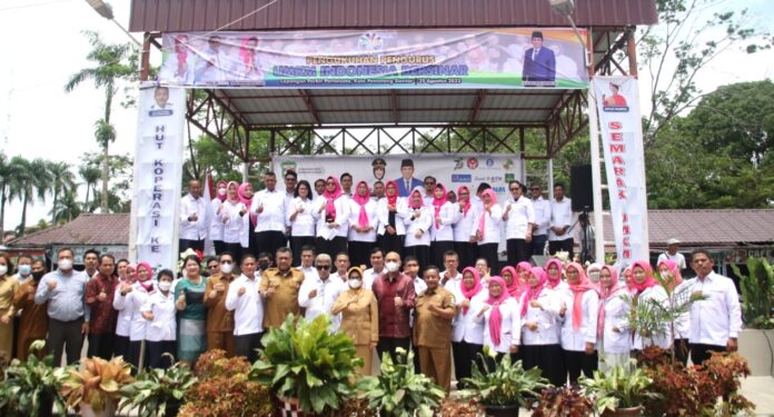 Foto bersama Wali Kota, Susanti Dewayani bersama Ketua Dekranasda, Kusma Erizal Ginting dan pengurus UMKM Indonesia Bersinar serta sejumlah peserta yang hadir.