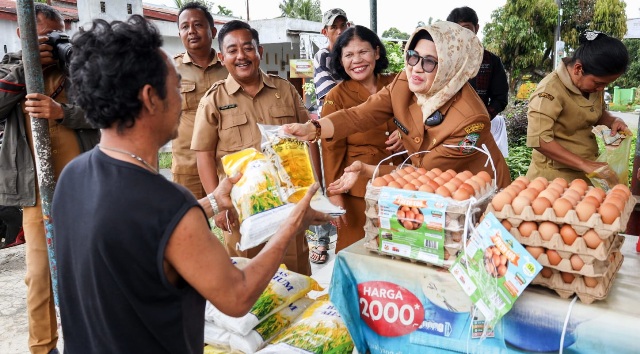 Di lokasi Pasar Murah, Susanti sempat melayani masyarakat yang ingin membeli bahan pokok. Dengan ramah dan penuh senyum, orang nomor 1 di Siantar ini berbaur dengan warga yang didominasi kaum perempuan.