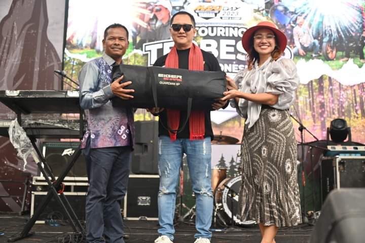 Sebagai tanda kehormatan atas hadirnya Yamaha Maxi Day 2023 Touring, Ketua TP PKK Humbahas, Lidia Dosmar Banjarnahor memberikan cenderamata dan oleh-oleh khas daerah itu kepada General Manager Marketing dan Promosi Alfa Scorpio, Jonny Lee. (Rel)